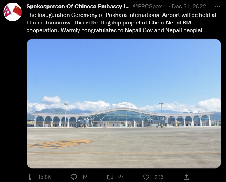 In its congratulatory tweet on Saturday, the Chinese Embassy in Kathmandu said the construction of a modern international airport is the realisation of a long cherished dream of people in Pokhara.